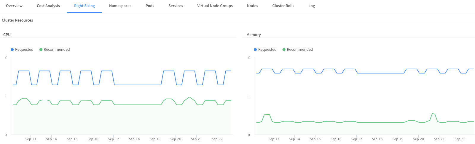 Right Sizing recommendations are provided per container and summarized for the entire workload for easy presentation at a high level. Recommendations per container enable you to easily understand exactly which applications require changes in resource requests and implement those changes quickly.